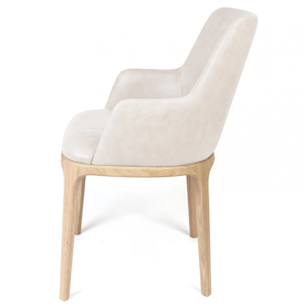 Movano Arm od Claudie Design to eleganckie krzesło tapicerowane z wysokim oparciem i wygodnymi podłokietnikami. Jego forma subtelnie łączy miękkość wykończenia z naturalną strukturą drewna, tworząc autonomiczny mebel, który doskonale sprawdzi się zarówno w jadalni, salonie, jak i przestrzeniach komercyjnych.