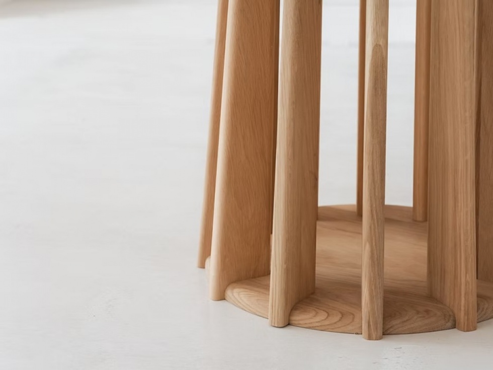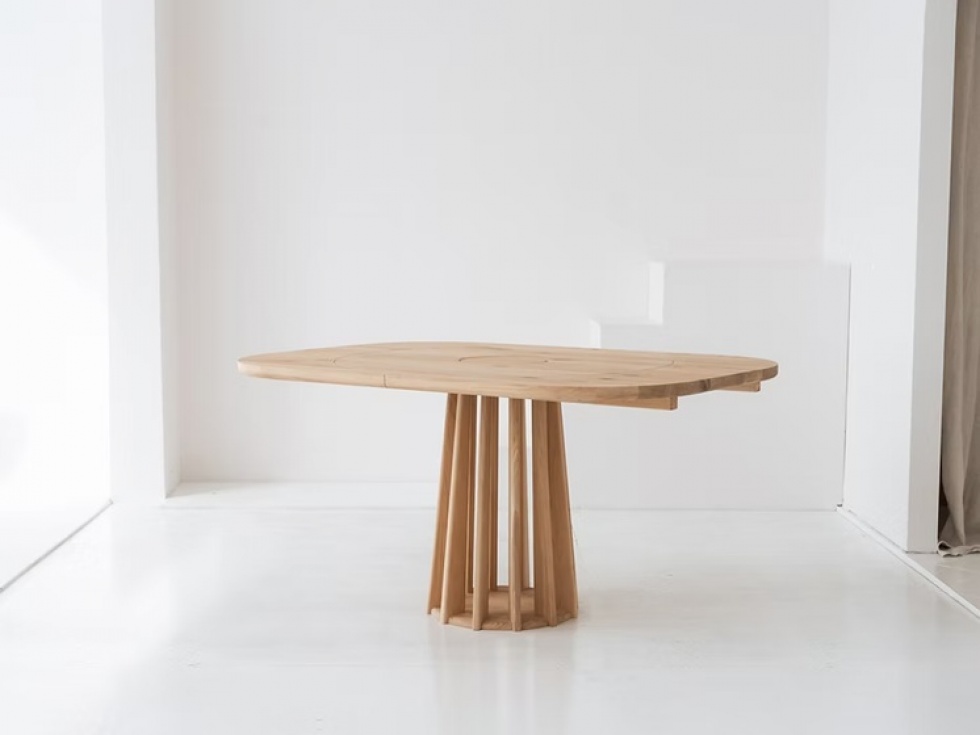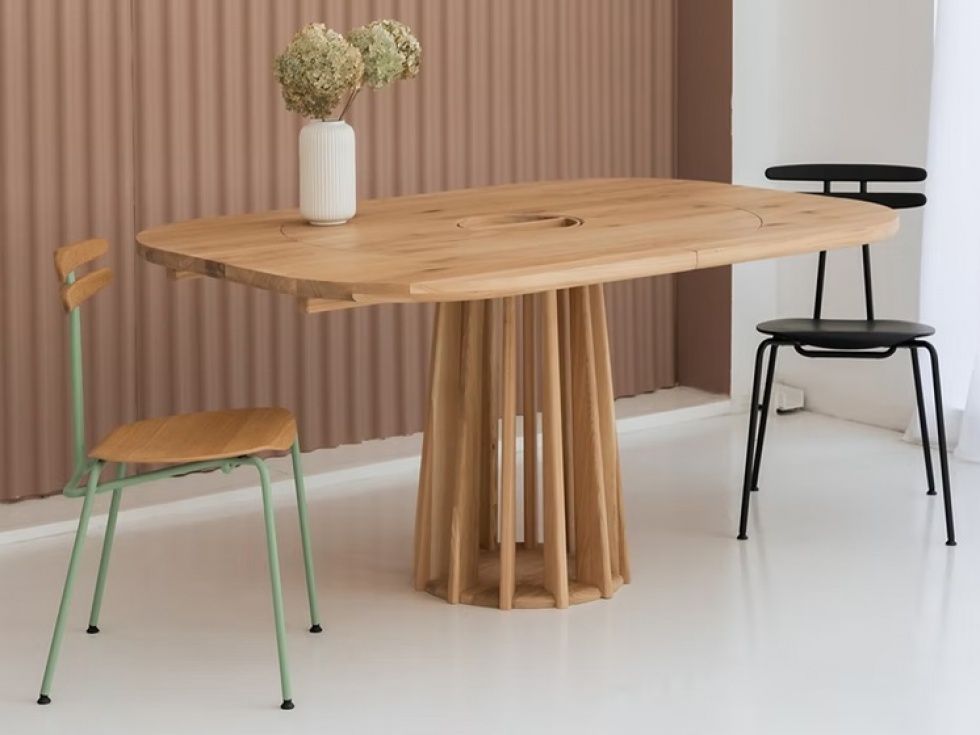 VASO to minimalistyczny, elegancki stół wykonany w 100% z litego drewna dębowego. Jego okrągły kształt podkreśla naturalny charakter materiału, a opcja rozkładania z funkcjonalnym modułem wymiennym pośrodku blatu dodaje mu uniwersalności i stylu.